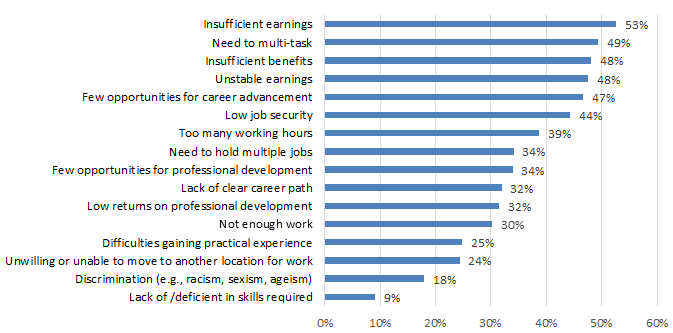 The survey results suggest that insufficient earnings and benefits are two of the most significant challenges facing cultural workers, cited by 53 per cent and 45 per cent of all respondents, respectively. These challenges appear to be more pressing in domains characterized by high rates of self-employment and part-time working arrangement, including live performance, visual and applied arts, written and published works, and sound recording. In fact, close to 80 per cent of workers in sound recording cited insufficient earnings and benefits as obstacles in their working life.